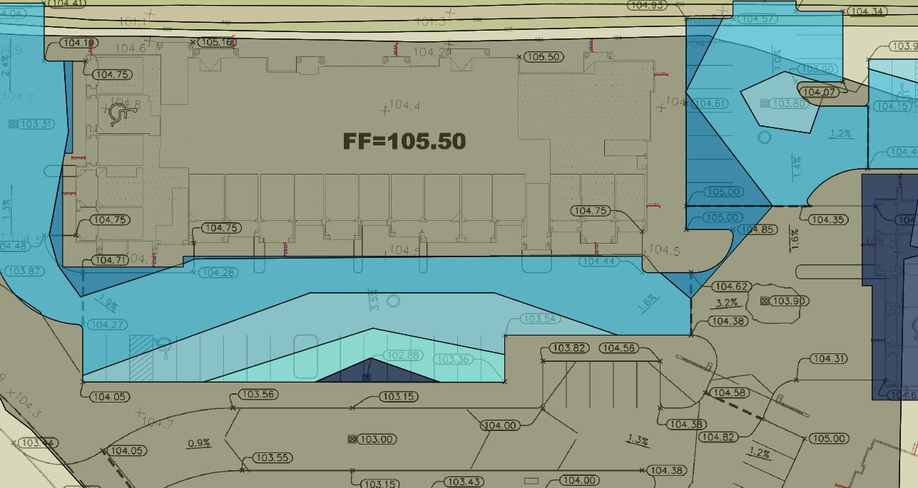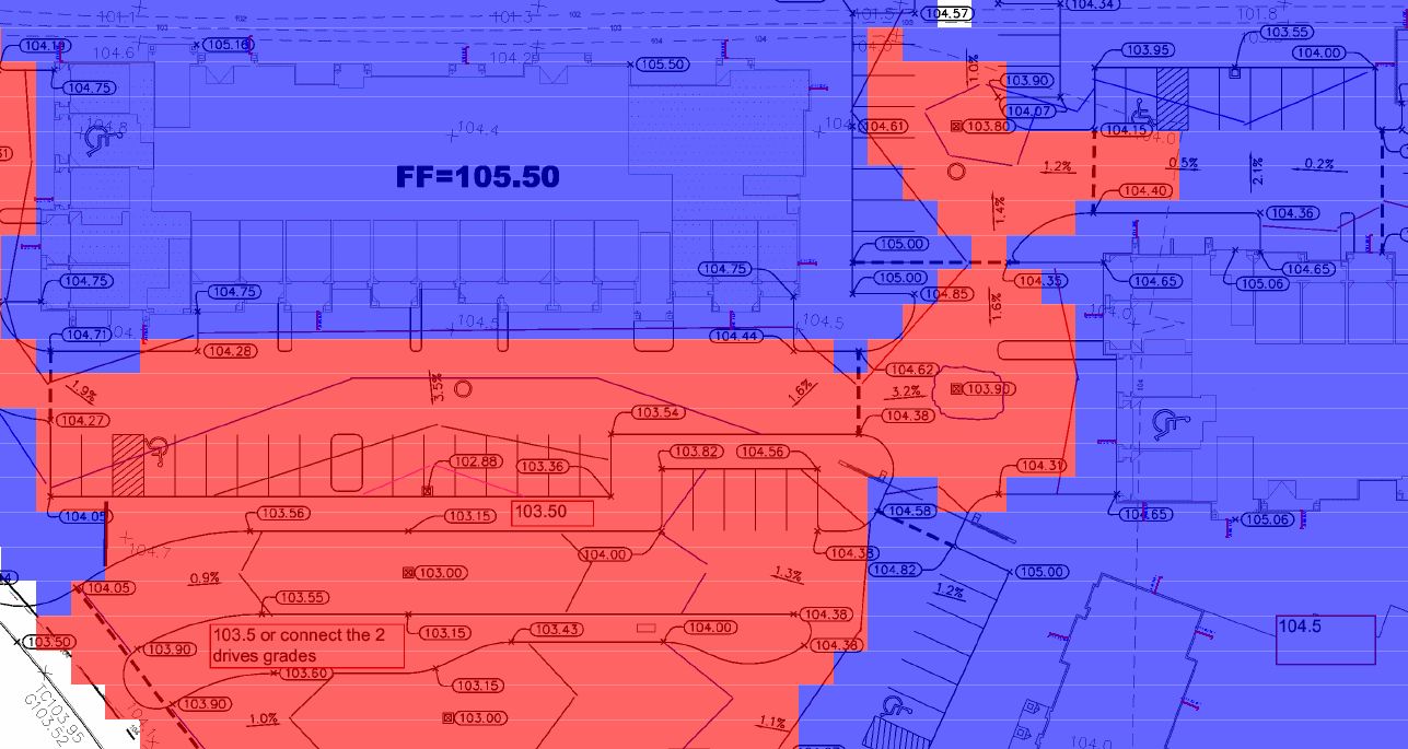 Earthwork Take-off - We can provide a detailed take-off of the earthwork from the engineered grading plans, showing the site areas with cuts and fills. This can be used to analyze the grading design in order to reach a balanced site. It also gives you the quantities when negotiating with the grading contractors. The quantities are shown in an Excel formatted spreadsheet with screen shots emailed to you. These are some examples of the take-off "screen shots". Digitized Site Plan - Brown Shades are Existing Grades, Blue Shades are Paving Subgrades